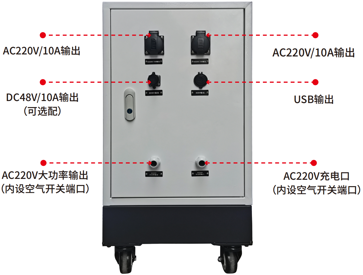 本产品是一款便携式内置逆变器的储能产品,适用于家庭应急备电、户外旅行、应急救灾、野外工作等应用场合。产品内置磷酸铁锂电池,电池为 16串设计,电压为 51.2Vdc(16*3.2V),电池容量:200Ah,整机电量:10000Wh,本产品具有丰富的输出接口:DC12V、DC24C、DC36V、DC48V、USB口, AC 插座*4(中规/欧规 ,美规 )